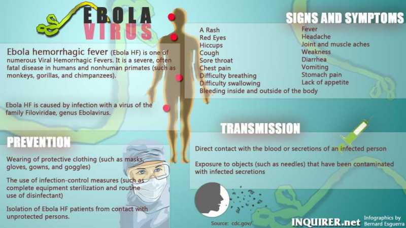 1. What is Ebola? It’s a hemorrhagic fever – the victims bleed from all over and bleed to death. It is contagious; being transmitted via contact with body fluids such as blood, saliva, semen or body discharges. It’s deadly, but there is a chance of survival. It kills 60-90% of those who contact it. Ebola victims can be treated for the symptoms and some can recover.